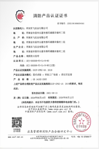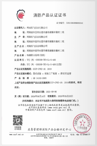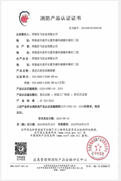 產品經應急管理部消防產品評定中心檢驗,獲得消防產品認證證書