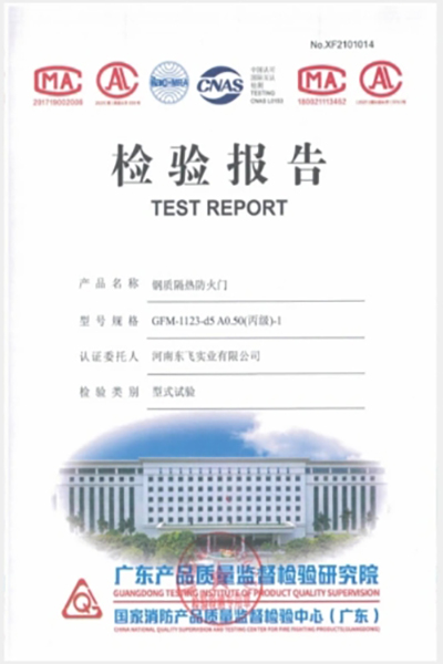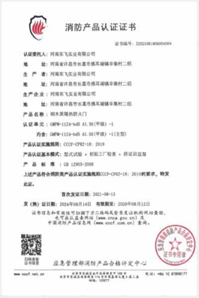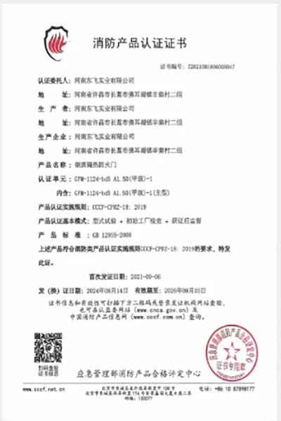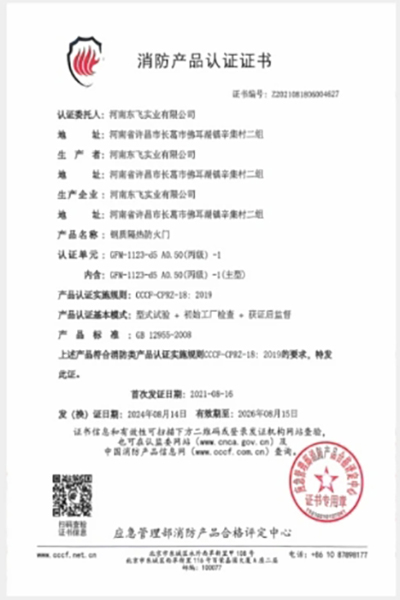鋼質隔熱防火門分為甲、乙、丙級,均嚴格按照 GB12955-2008《防火門》研制而成。“國家固定滅火系統和耐火構件質量監督檢驗中心”檢驗合格,并取得應急管理部消防產品合格評定中心發放的“中國國家強制性產品認證證書”。